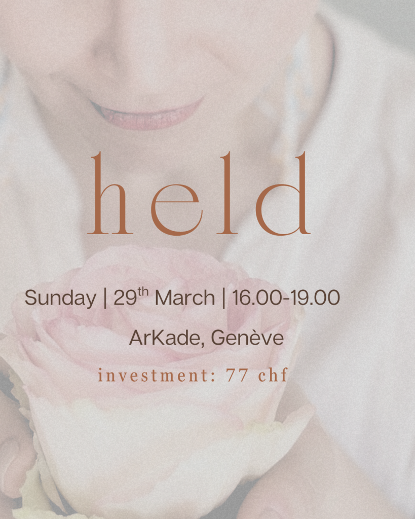 HELD Welcome Beautiful Soul, We live in a world that moves fast, where feelings are often ignored or hidden.HELD is a safe, intimate circle for sensitive women who want to slow down, acknowledge their emotions and nourish their nervous system. Here, you won’t be asked to “do” anything except be present with yourself and your experience. It’s a chance to:pause from the constant pressure of lifeexplore emotions you’ve buried or avoidedconnect deeply with yourself and other women in a supportive circleleave with clarity, calm and renewed inner strength HELD March 29thIn Your OpeningHow to open without overwhelming yourselfSpring is often associated with blooming, expansion, and stepping forward.But for many bodies, opening doesn’t feel exciting – it feels exposing. More light, interaction, being seen.And the nervous system can quietly ask: Is it safe to open?This space is not about pushing yourself to bloom. It’s about learning how to soften, expand, and open, while staying anchored in yourself.Through guided touch, somatic awareness and nervous system-based practices, you’ll explore:* what “opening” actually feels like in your body*how to soften without collapsing your boundaries*move at pace that feels safe, not forced*create space for feeling and subtle shiftsThis is a space where your pace is respected. Where opening can be slow. You don’t have to bloom all at once.You just have to begin in a way your body can trust. Location:ArKade Thérapie & Training 8, Chem. de la Florence, 1208 GenevaTime: 16h00-19h00Investment: 77 CHF Join HELD: HELD CHF 77.00 Add to basket